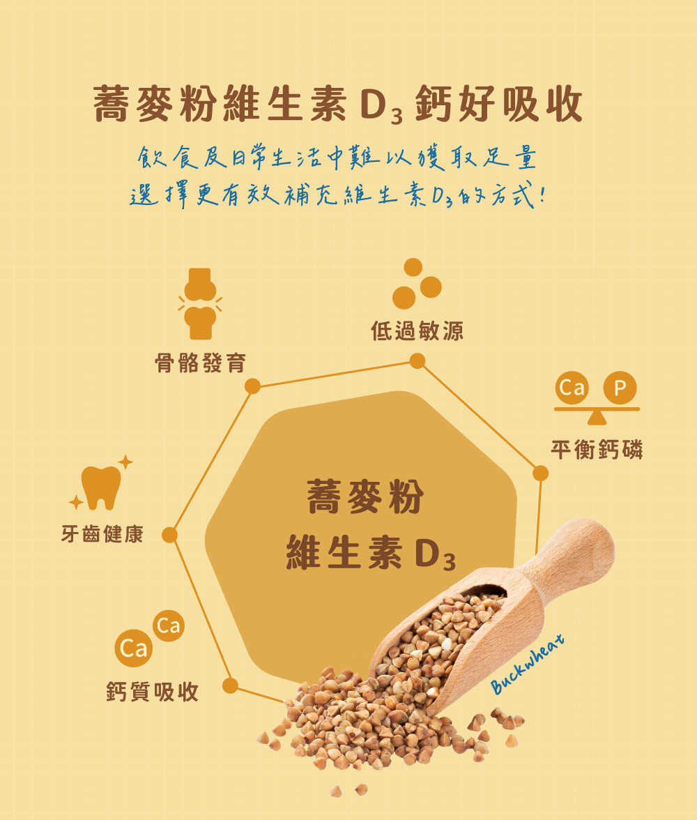 嚴選低過敏原蕎麥維生素D3,協同鈣質吸收、幫助牙齒骨骼發展