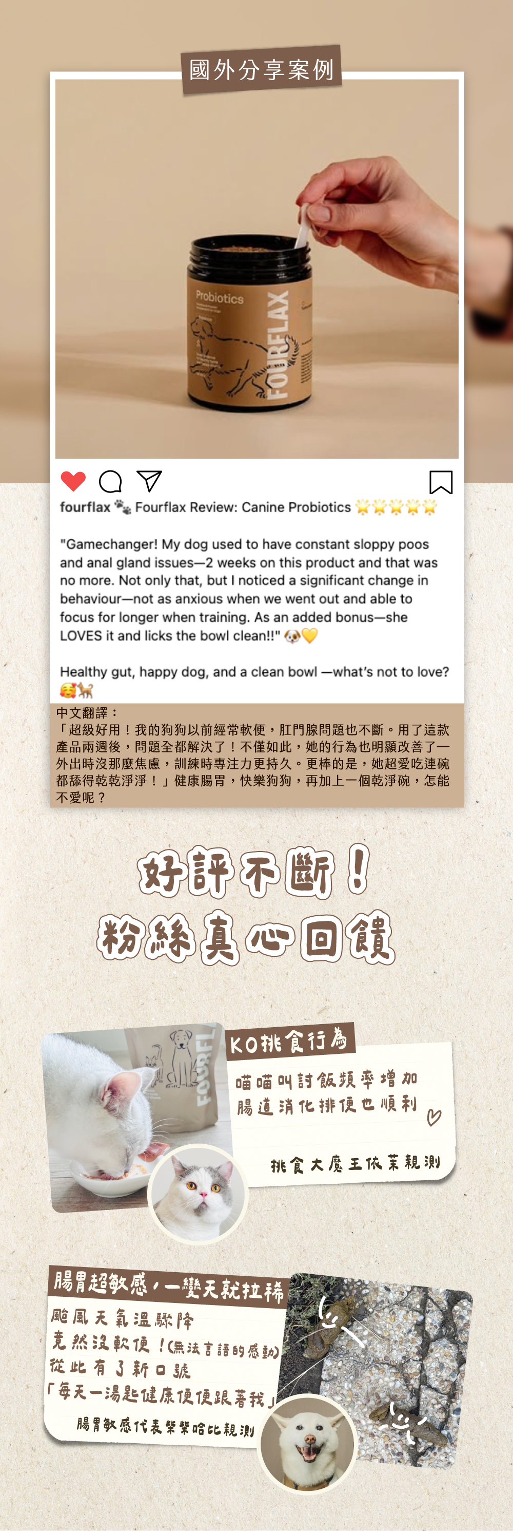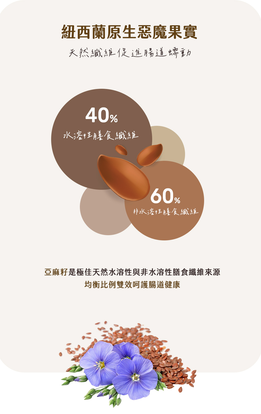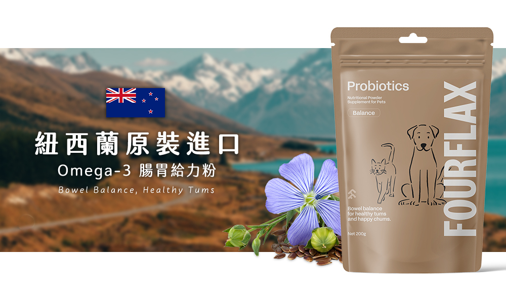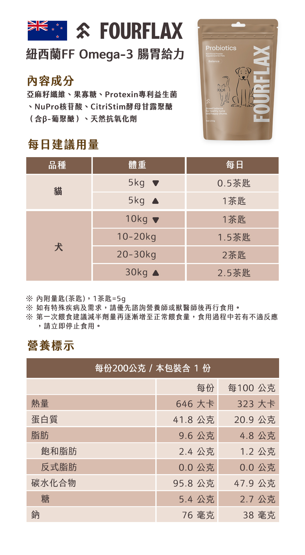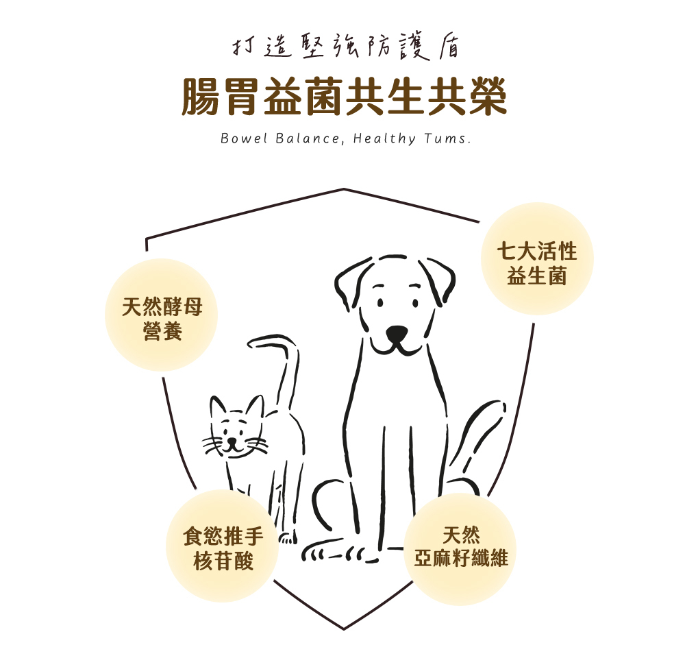亞麻籽纖維、益生菌、酵母(Beta-葡聚糖)、核苷酸